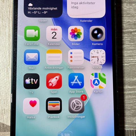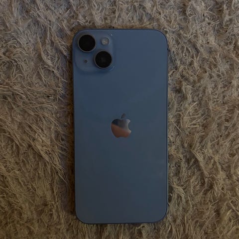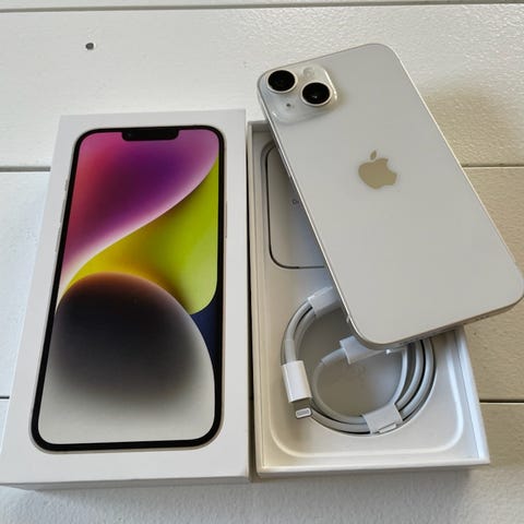 Apple iPhone 14 med 128 GB lagringsutrymme. Mobilen är i använt skick, några bucklor på ramen (bild) och några små repor som syns i direkt solljus. Dock känner man dem inte när man rör skärmen. 78% batterihälsa vilket ändå håller länge då modellen har väldigt stort batteri. Laddkabel och ett svart skal medföljer, samt helt oöppnade hörlurar med Lightning uttag.