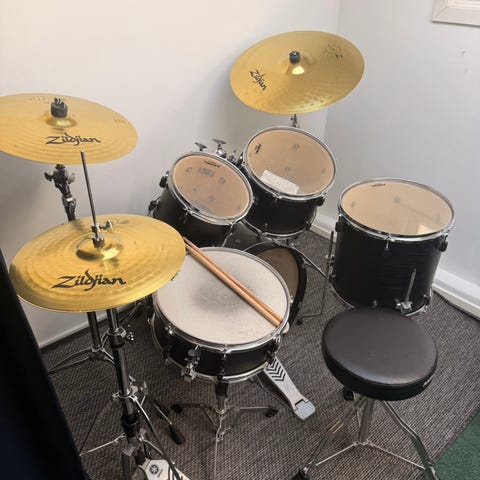 Ludwig Accent trumset i svart klädsel. Setet består av 2 bastrummor (20x16"), 3 pukor (10"/12"/12"), 2 golvpukor (14"/14") och virveltrumma (14x4,5"), kompletterat med 3 cymbaler (hi-hat 14"/crash 17"/Ride 20"). Cymbalernas sound i linje med A Zildjian medium-rock. Stativ enligt bilder. Obs, helt nytt Tama hi-hat-stativ anpassat för dubbelpedal. Trummorna har skinn i bra skick, Evans och Remo. För att vara Ludwigs instegstrummor har det ändå fungerat perfekt live och i studio. Setet används på ep:n 4 By 4 (2025) med The Men; finns på Spfy.