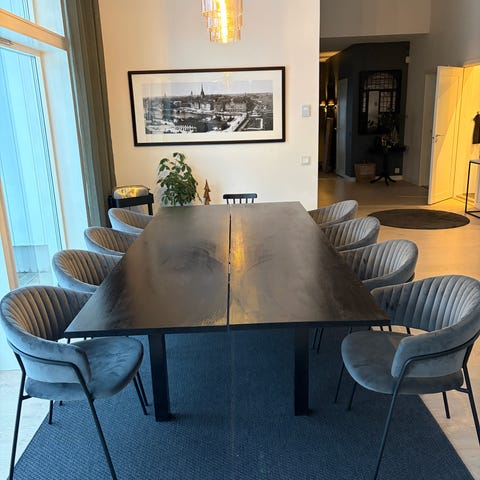 8 platser som kan utökas med skivor så att det rymmer 12 personer.