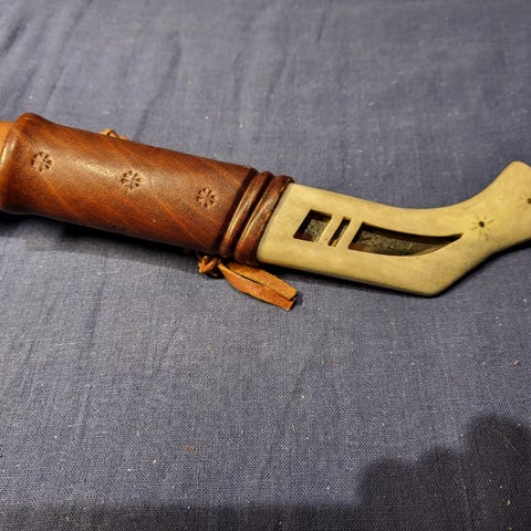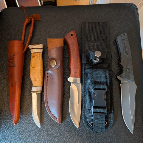 Två knivar med damaskblad, den ena med handtag trä och den gröna.