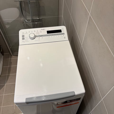 Perfekt för mindre badrum eller trånga utrymmen tack vare smidig toppladdning.