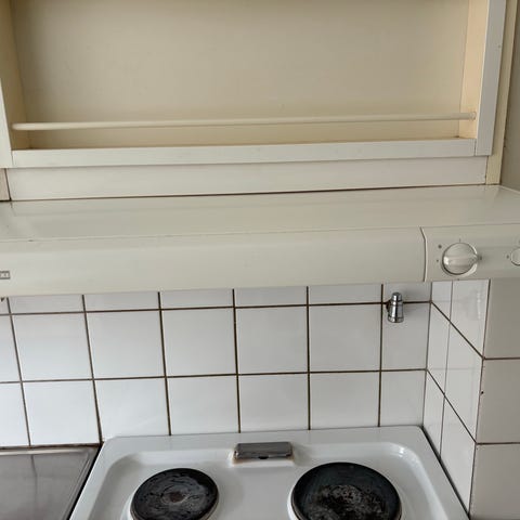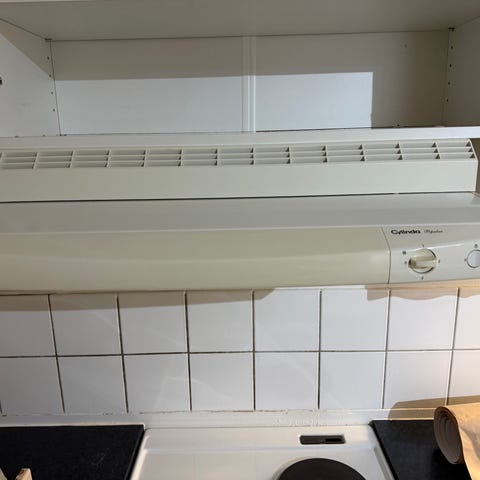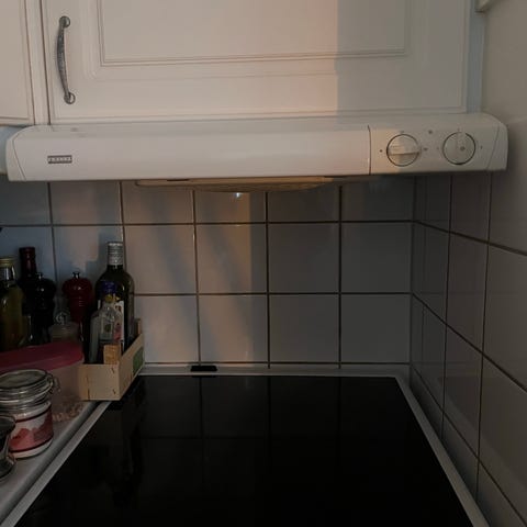 Vit fläktkåpa/köksfläkt bredd 700 mm för montering ovanför spis. Modellen har två vred på fronten för styrning av funktioner samt inbyggd belysning. Undersidan är utrustad med metallfilter som kan tas loss för rengöring. Avsedd för inbyggnad under överskåp i kök. Ansluts med stickkontakt enligt bild.