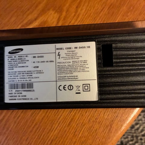 Subwoofern är fristående med trådlös anslutning till soundbaren. På baksidan finns strömanslutning och modellbeteckning PS-WH7501. Systemet drivs med 110–240 V, 50–60 Hz, 250 W.