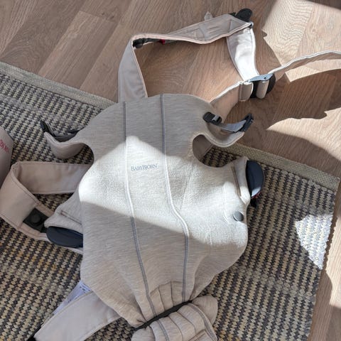 Babybjörn Baby Carrier Mini bärsele i grått tyg. Modellen är avsedd för att bära spädbarn nära