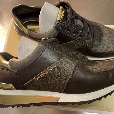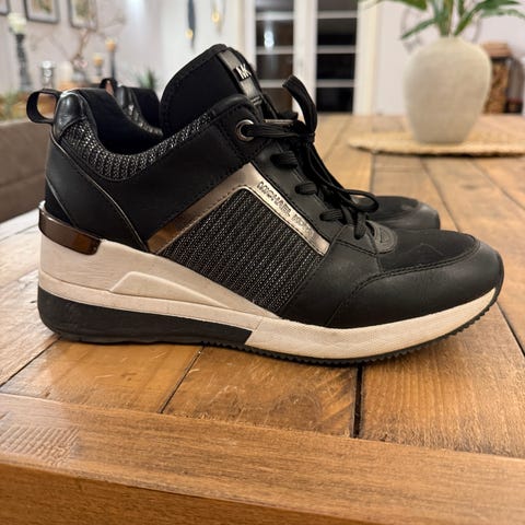 Michael Kors sneakers helt oanvända i sin kartong. Endast provade men fel storlek för mig då de är små stl 39. Passar snarare stl. 37-38. Svart läder och leopard mönster. Mycket snygga!