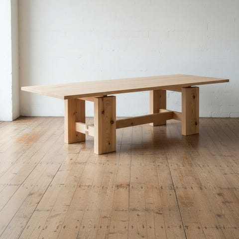 Bordet kombinerar en gedigen benställning i massiv furu med en elegant toppskiva i 5 mm tjock aluminium, formad som en superellips.