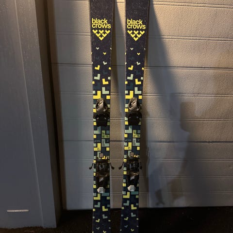 Black Crows Junius skidor i längd 150,5 cm i blå färg med mönster i gult och turkos. Skidorna är utrustade med monterade justerbara Marker Free 7 bindningar.
