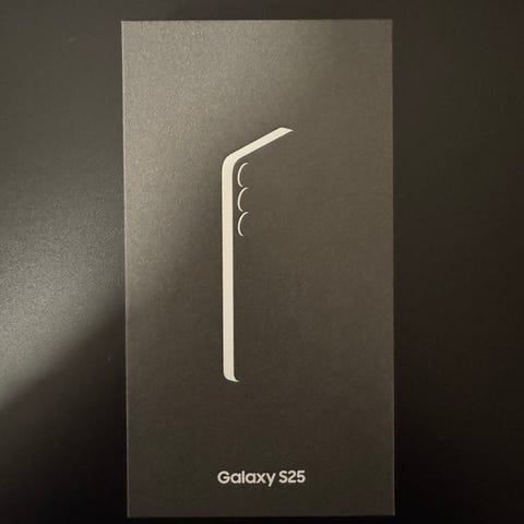 Samsung Galaxy S25 mobiltelefon med 128 GB internminne. Modellen har trippelkamera på baksidan och en stor pekskärm på framsidan. Telefonen levereras i originalförpackning enligt bilderna. Passar för användning med appar, surf, foto och vardaglig kommunikation.