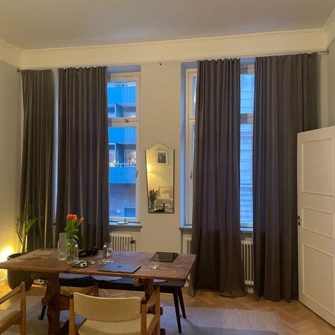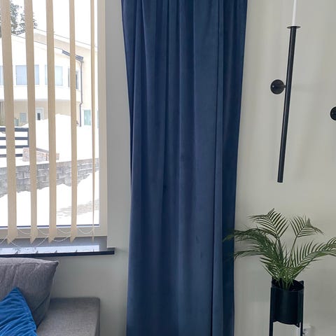 Två gardinlängder i mörkgrön tjock sammet. Funkar bra för mörkläggning i sovrum. Eller bra metervara, 6 meter för tex möbler. Lite solblekt baksida.