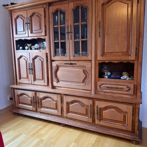 Stor tredelad hylla med skåp, vitrindel och inbyggd belysning. Mycket fint skick och gott om förvaring.