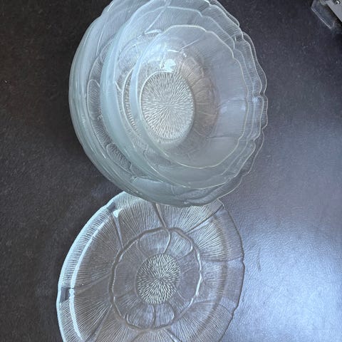 Skålar och fat i genomskinligt glas med bladliknande struktur. Setet består av flera skålar samt ett större runt fat. Skålarna har en diameter på cirka 18–22 cm och fatet är cirka 27–28 cm i diameter. Passar för servering av sallad, frukt, snacks eller efterrätter. Glaset är lätt strukturerat vilket ger en dekorativ yta.
