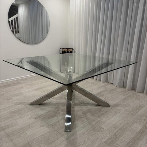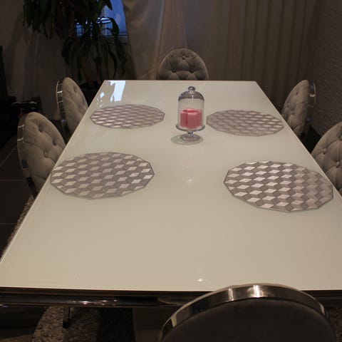 Elegant matgrupp: Glasbord + 4 beige sammetsstolar.