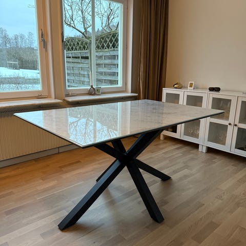 Säljer en fin och modern matgrupp som passar perfekt för den lilla familjen eller paret. Möblerna är i mycket gott skick och kommer från ett rökfritt hem. Bord: Rektangulärt glasbord med stabilt, svart metallunderrede.Stolar: Fyra bekväma stolar i beige sammetstyg ("velvet") med svarta ben. Mått bord 140 cm X 80cm. Hämtas I Högsbo