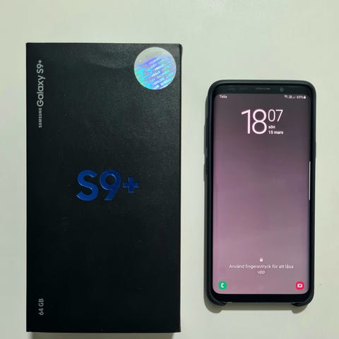 En samsung galaxy s9+ med 64mb minne i väldigt bra skick och fungerar som den ska.