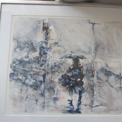 Inramad tavla med motiv av två personer med cyklar. Bilden är utförd i flera färger med tydliga inslag av svart, gult, rött och blått. Tavlan är monterad med passepartout och har en enkel guldfärgad ram. Baksidan är försedd med upphängningsvajer för väggmontering. Passar som väggdekoration i exempelvis vardagsrum, hall eller kontor.