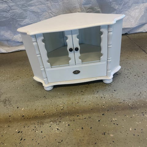 Möbeln står på hjul för enkel förflyttning. Den har ett öppningsbart glaslock upptill, ett öppet fack med glashylla, ett skåp med dörr och hyllplan samt en utdragbar låda nederst. Passar som tv-möbel eller mediabänk med plats för elektronik, tillbehör och förvaring av mindre saker.