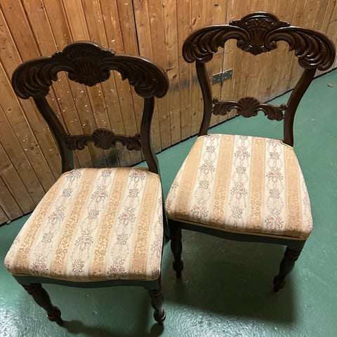 Stolarna är stabila och i bra skick för sin ålder. Sittdynorna är något slitna men fullt användbara – alternativt perfekta för den som vill klä om dem.