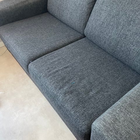 Säljer en stilren och bekväm tvåsitssoffa i ljusgrå tyg med träben.