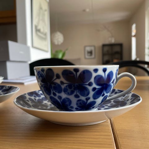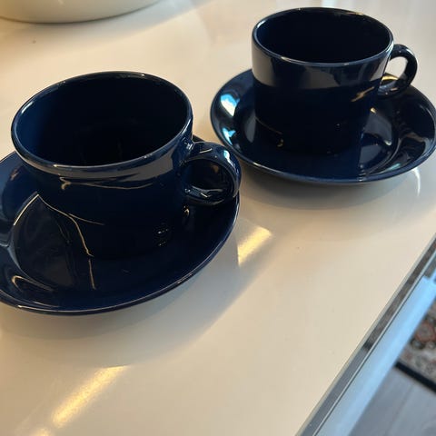 &Tradition Lava espressokoppar med fat i blått porslin. Setet består av espressokoppar med tillhörande fat, utformade för servering av espresso eller andra små varma drycker. Kopparna har en mörkblå nyans med matchande fat och är förpackade i askar om flera delar, lämpliga för användning i kök eller vid dukning av kaffestunder.