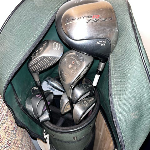 Spalding Executive golfset med bag. Setet innehåller flera järnklubbor samt woods/hybrider med headcovers. Golfbagen är en bärbag med benstativ och flera fack för klubbor och tillbehör. Färgkombinationen på klubbor och bag är främst svart med röda och vita detaljer. Lämpligt för spelare som söker ett komplett set med matchande bag för användning på golfbanan eller träningsområdet.