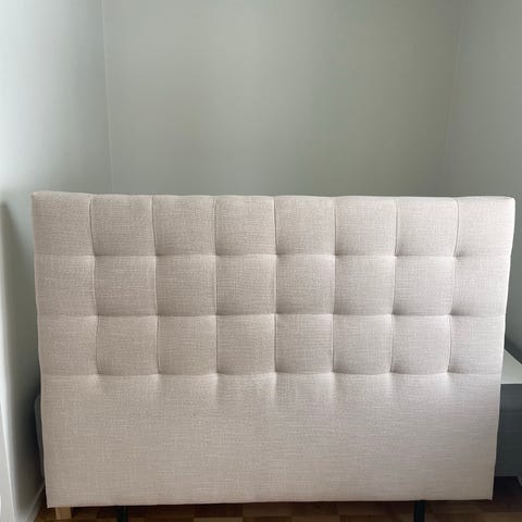 Jotex sänggavel i rosa tyg. Gaveln har en vågformad/segmenterad ovankant med flera rundade sektioner. Klädd i mjukt textilmaterial och avsedd att placeras bakom en säng mot väggen. Passar en 160 cm bred säng. Fint skick