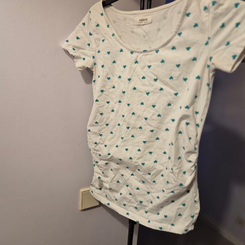 Gravidpyjamasset med vita prickar. Setet bestär av en kortärmad tröja med krage och bröstficka, och ett par matchande shorts med resăr i midjan.