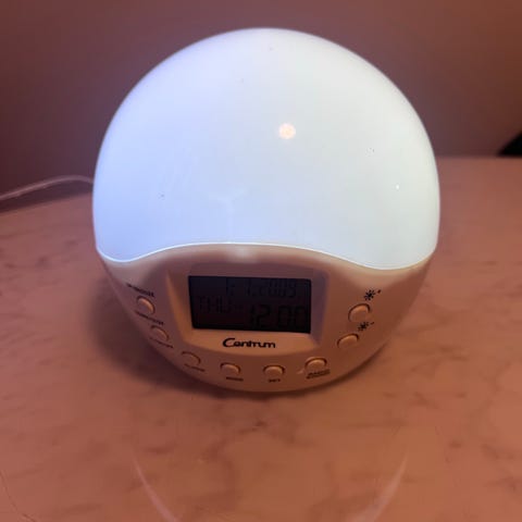 Digital display på framsidan och knappar för tidinställning, alarm, snooze och sleep-funktion på ovansidan.