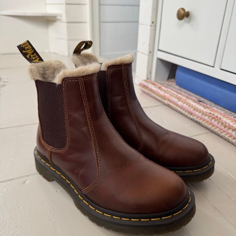 Dr. Martens vinterskor i storlek 42. Bruna kängor med dragkedja i sidan och resårpanel för enklare på- och avtagning. Ovandel i läder och fodrad insida som ger extra värme. Grovmönstrad yttersula i gummi för bättre grepp på underlag. Passar som vardagsskor under kallare säsong.
