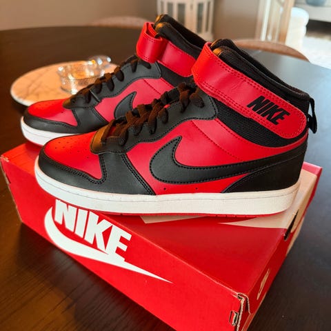 Nike sneakers i storlek 40. Skorna är höga med svart ovandel och vit sula samt vit Nike-logga på sidorna. Snörning framtill och vadderad plös och häl för ökad komfort. Passar för vardagsbruk och fritidsaktiviteter.