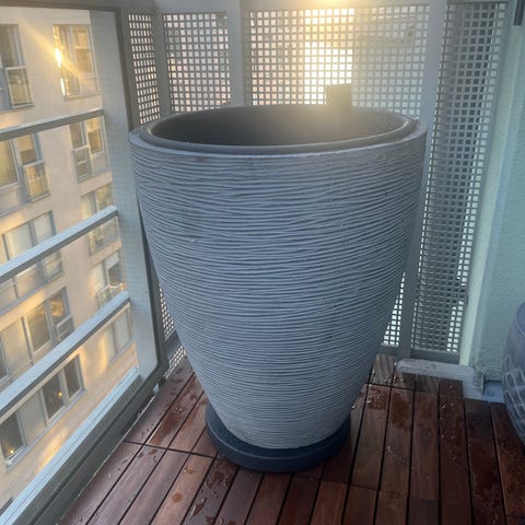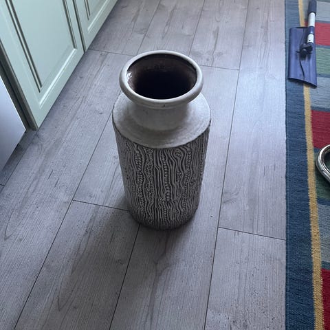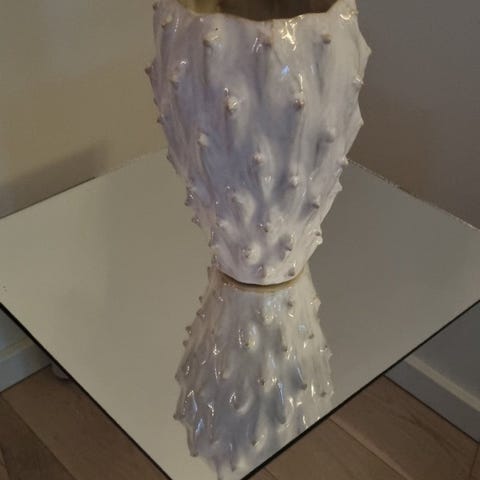 Stor kruka i vit keramik med fint mönster i Medelhavsstil. Fint skick. Säljes p.g.a. platsbrist.