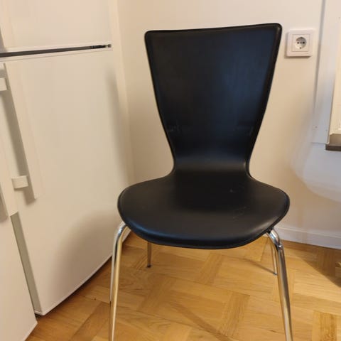 2 st vita, stapelbara stolar med kromade ben. Använda, men i bra skick. Några små repor här och var (se bild) men inget som syns särskilt mycket. Liknar ”Sjuan” och ”Myran” (Arne Jacobsen/Fritz Hansen).