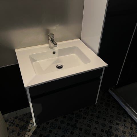 Vit kommod inkl. Ben. Vitt handfat i bra skick. Kommoden har lite fanersläpp, se bild. Spegel ingår.