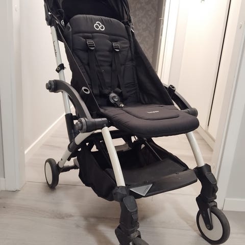 Beemoo EasyFly 2 sulky i svart och grått tyg. Vagnen har justerbart ryggstöd, fempunktssele och avtagbar bygel.