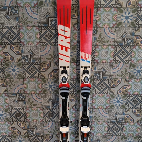 Atomic slalomskidor med bindningar samt tillhörande pjäxor. Skidorna har klassisk carvingform och är anpassade för piståkning. Undersidan visar hel belagsyta och stålkanter. Ovansidan har röd och vit design med Atomic-logotyp samt justerbara bindningar. Pjäxorna är hårda alpina pjäxor i svart och blått med flera spännen och rem upptill för stabil passform. Utrustningen passar för alpin skidåkning i backe.