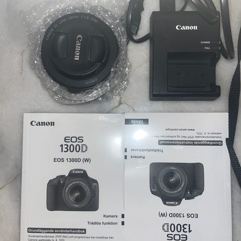 Kameran är en digital spegelreflexkamera (DSLR) med utbytbar optik. På bilderna syns kamerahus med objektiv, objektivlock, kamerarem samt batteriladdare.