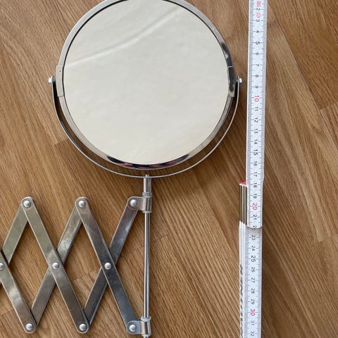 Smedbo Pima rak- och sminkspegel väggmodell med LED-belysning. Rund spegel med förstoring (markerad med 3x på glaset) och integrerad ljusring. Väggmonterad modell med justerbar arm och spiralformad anslutningskabel. Levereras med väggfäste och monteringsdetaljer enligt bilderna. Lämplig som rak- eller sminkspegel i badrum eller vid sminkbord.