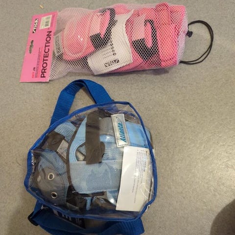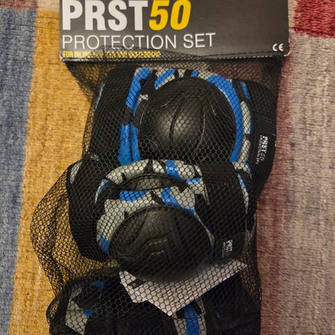 Skyddsutrustning bestående av knäskydd, armbågsskydd och handledsskydd i svart färg. Utrustningen har hårda skyddsskal och justerbara remmar för att sitta stadigt på plats. Passar för exempelvis rullskridskor, långfärdsskridskor, snowboard, slalom, skateboard eller annan liknande aktivitet där extra skydd behövs för knän, armbågar och handleder. 50 kr/par.