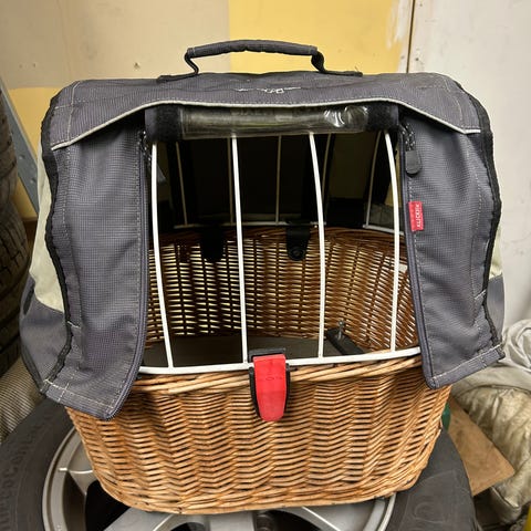 Transportbur för katt eller liten hund i beige och grå textil med svart kant. Buren har nätfönster och dragkedjeöppning framtill samt bärhandtag upptill. Inuti finns en löstagbar mjuk liggkorg i grått och vitt med hög kant. Bottenplattan i buren är plan och stabil. Lämplig för transport eller som viloplats hemma och i bilen. Båda för 600kr