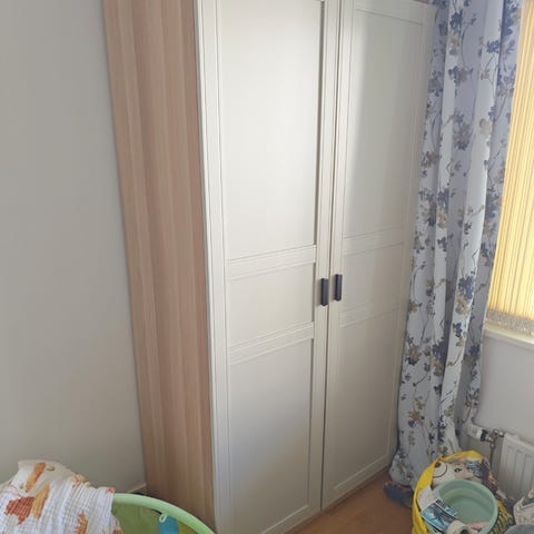 Säljer en monterad Ikea Garderob. Den är varsamt använd, alla hyllor sitter bra i garderoben. Det enda slitage är att där är två små fläckar insidan av garderoben samt på utsidan av ena sidan är där små svarta fläckar från klister/tejp som säkert man kan själv ta bort (se bilderna)