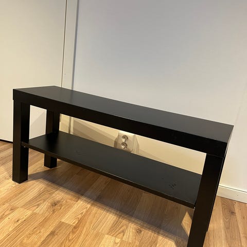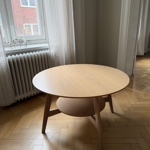 Rektangulärt soffbord i brun träfinish med tydlig träådring. Bordet har fyra raka ben och en slät bordsskiva. Passar som soffbord i vardagsrum eller som avlastningsbord i andra rum. Bordet står på en matta på bilderna, vilket visar ungefärlig storlek i förhållande till fåtöljer och soffa runtomkring.