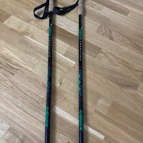 Skidstavar i svart färg med korkliknande handtag och handledsremmar. Stavarna har trugor och metallspetsar anpassade för längdskidåkning. Passar för användning vid tur- eller motionsåkning på snöunderlag.