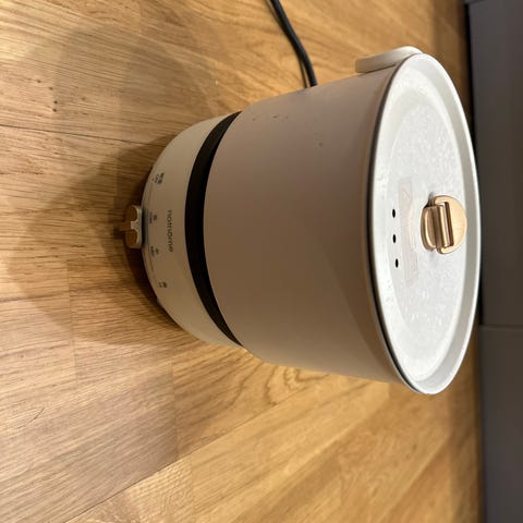 Hotpot i röd färg med löstagbart glaslock. Grytan har elanslutning och står på små ben för stabilitet på bänken. Insidan är i metall.