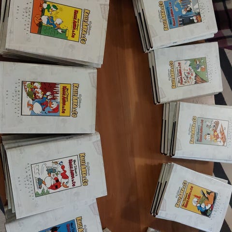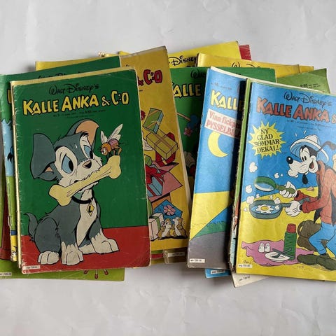 Samtliga tidningar från starten 1948 till 1960 inbundna i bokform. Hela 36 böcker med Kalle Ankas äventyr. Norstalgitripp med de äldsta äventyren från Disney i bokform.