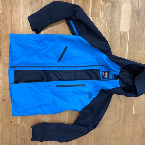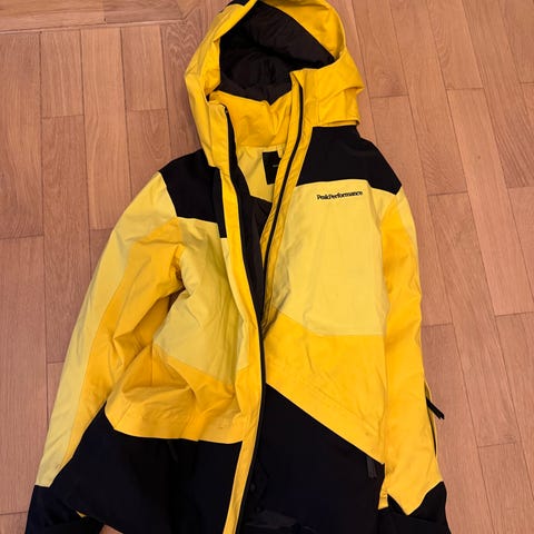 Jättefin oanvänd skidjacka med kontrasterande dragkedjor. Jackan har fast huva med justeringsmöjligheter, bröstfickor med dragkedja samt ärmficka. Invändigt finns snölås och fästen, samt Recco-reflektor.