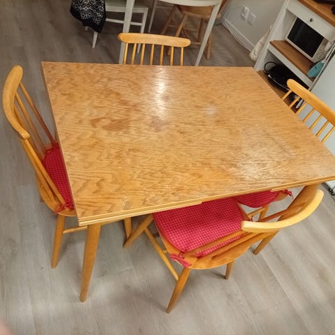 Köksbord med iläggsskiva och 6 stolar