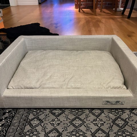 Hundbädd i rektangulär modell med mjuka, vadderade kanter. Yttermåttet är 120 cm i längd, lämplig för stora hundar beroende på ras och sovstil. Bädden är klädd i ett grönt, melerat tyg och har broderad dekor på sidan. Passar för användning inomhus som viloplats för hund.