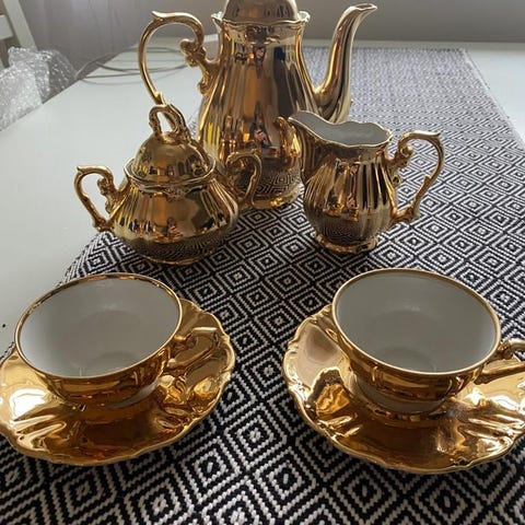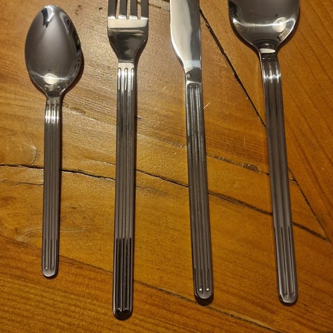 Säljer ett stilrent bestickset i guldfinish. Innehåller knivar, gafflar, matskedar och teskedar enligt bild. Fint skick och tål diskmaskin.