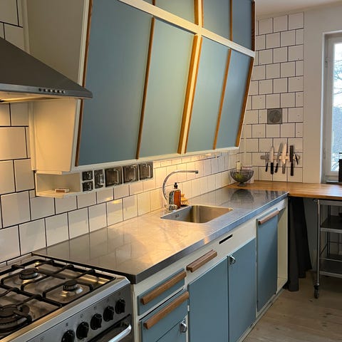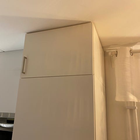 Vit köksinredning med flera skåpsluckor och överskåp. Luckorna är släta i vit färg och visas både monterade och demonterade på bilderna. Inredningen består bland annat av högskåp, överskåp ovanför diskbänk samt överskåp över dörröppning och kyl/frys. Passar för kök eller förråd där man vill komplettera eller bygga förvaring med vita skåpsluckor och skåpstommar i liknande stil.