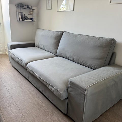 IKEA Älvdalen bäddsoffa med schäslong i mörkgrått tyg. Soffan är en 3-sitsmodell som kan fällas ut till säng. Mått enligt produktbild: bredd ca 196 cm, djup ca 82 cm, höjd ca 81 cm, höjd ryggstöd ca 75 cm och bäddlängd ca 196 cm. Schäslongen ger extra liggyta och förlänger soffans längd. Passar som sitt- och sovmöbel i vardagsrum, gästrum eller mindre utrymmen där både soffa och säng behövs.