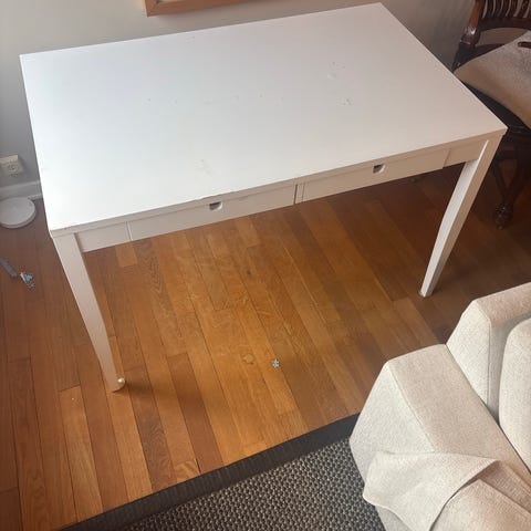 Stabilt skrivbord med låda. Älskar det egentligen. Men får inte plats. Lite slitage på ytan i form av vanligt slitage och färg från pennor. Men tror det är lätt att fixa om man stör sig på det.
